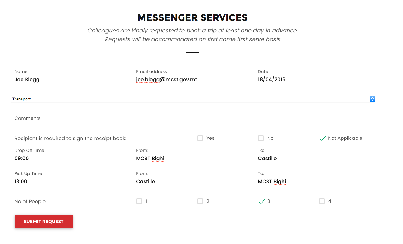 When entering the Messenger Service page you will see the below shown form that incorporates all the elements required to be able to request Messenger Services.