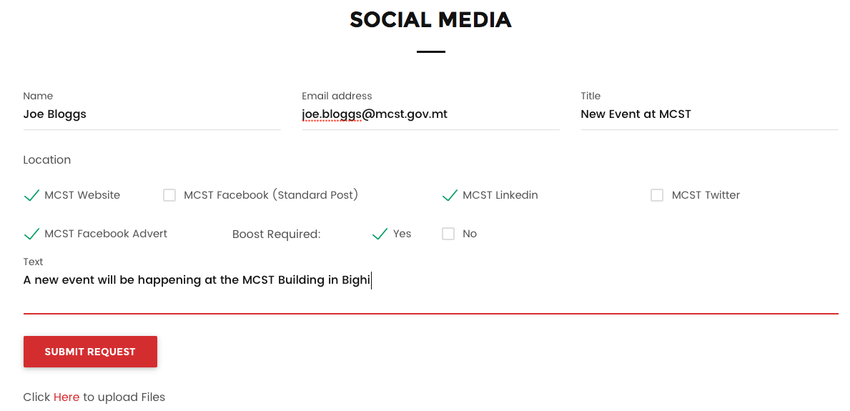 When entering the Social Media Request Services page (Click here to enter) you will see the below shown form that incorporates all the elements required to be able to request Social Media Request Services.